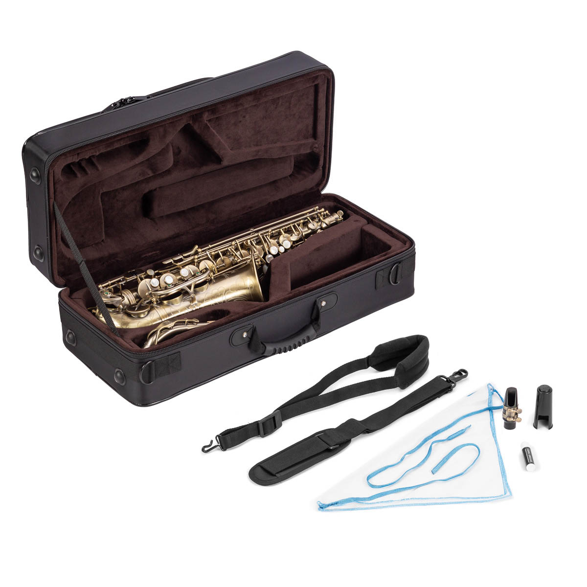 В комплекте: футляр, мундштук с лигатурой и колачком, гайтан, протирка, смазка, плечевой ремень для футляра.